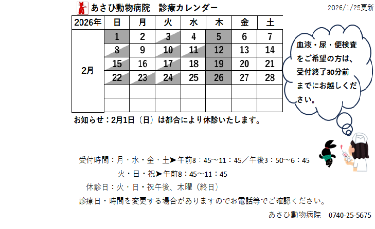 2月1日(日)は都合により臨時休診いたします。